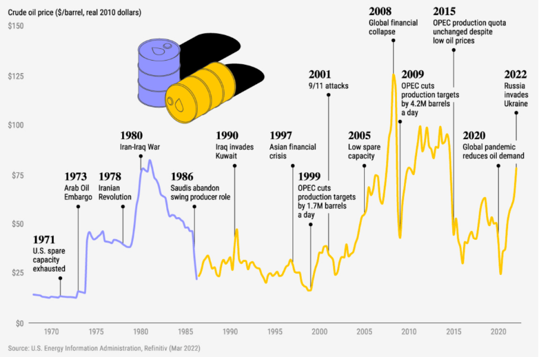 Crude oil dominates our energy imports. In 2024 it accounted for 67% of our imported energy.[3] It is also one of the more volatile markets. The U.S. is significantly affected by price spikes, many of which we could not predict or control.