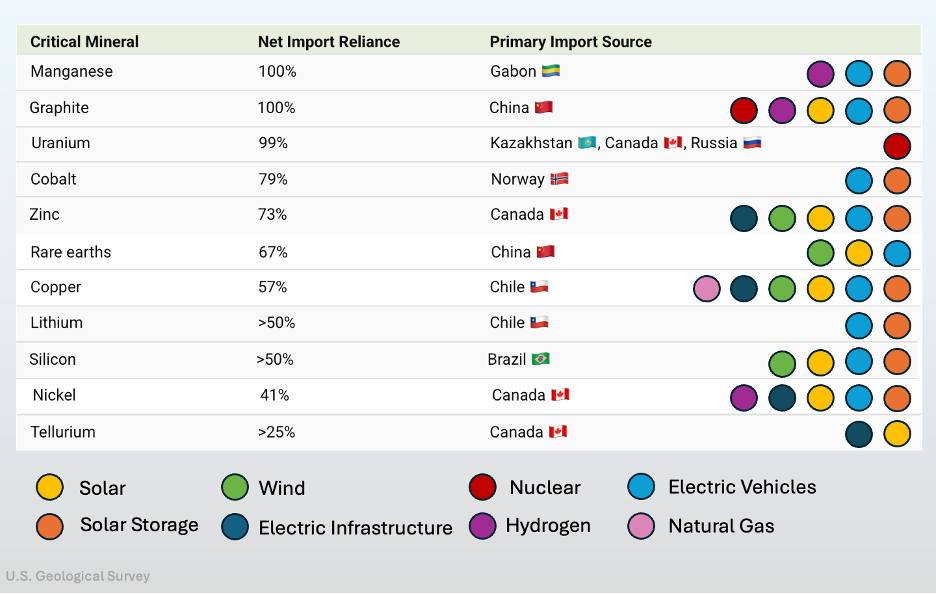 In some cases, we source 100% of an energy dependent critical mineral from foreign sources. This leaves us in a very vulnerable position. Below is just a snapshot of some of the critical minerals we depend on for energy and their primary sourcing.